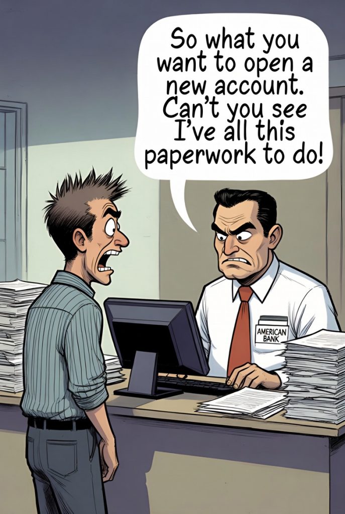 Instead, I gently interrupt a banker mid-conversation with another client: “Excuse me, any idea how long you’ll be?” His reply deserves to be preserved in the British Museum as the pinnacle of customer deterrence: “I don’t know how long it’ll be, and when I’m done I’ve got all this paperwork to do.” I stand there momentarily stunned and lost for words. I grit my teeth and resist the powerful urge to reply: “Oh splendid! And when you’ve finished shuffling those vitally important forms, do let me know — assuming the bank still exists after you’ve successfully repelled every potential depositor who might actually pay your salary. Honestly, if this is how they treat people trying to give them money, I’d hate to see what happens when you ask for it back.